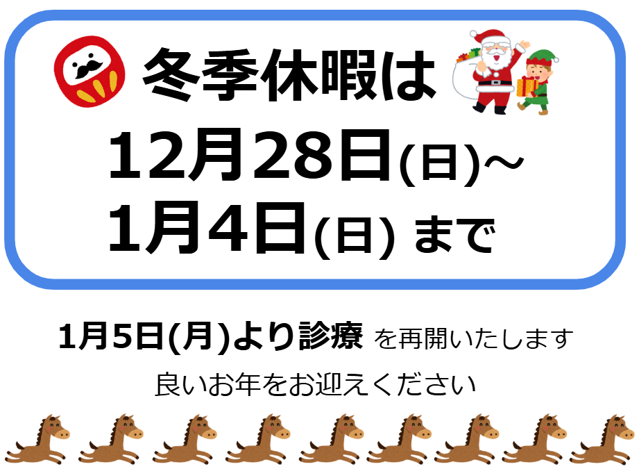 12月28日(日) ~ 1月4日(日) まで、当院は冬期休暇で休診となります。