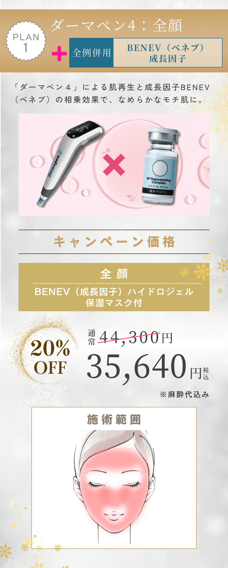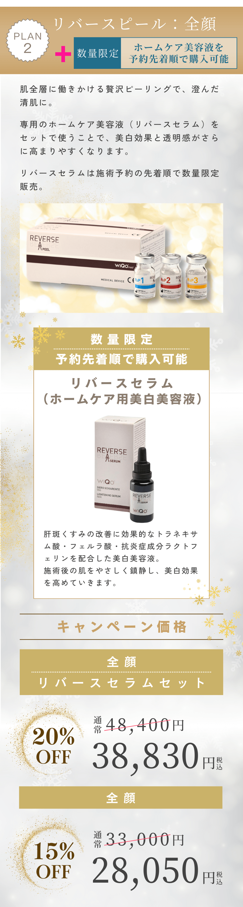 Winter Campaign(冬のキャンペーン) PLAN 1 PLAN 2 ☆こちらの「美容施術Web予約」からも予約可能です。※お肌の状態によりご希望に添えない場合があります。予めご了承ください。【どの施術を選ぶかお悩みの方へ】自分の肌にどの施術が合うかまだ分からない方は、一度通常診療で美容カウンセリングを受けてみることをおすすめします。通常診療の当日順番受付は「こちら」をご利用ください。